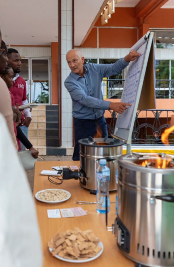 世界生物能源协会(WBA)主席Christian Rakos博士演示了使用改进炉灶使用生物质颗粒和木屑烹饪的原理和好处。