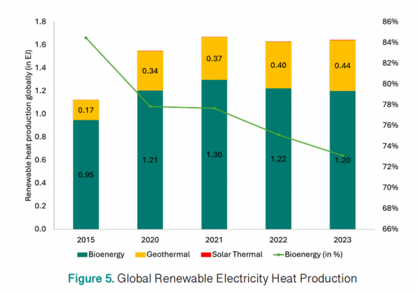 在供热方面,生物能源仍然是占主导地位的可再生能源,提供了全球73%的可再生热能。欧洲是明显的领导者,占全球生物质供热的四分之三。